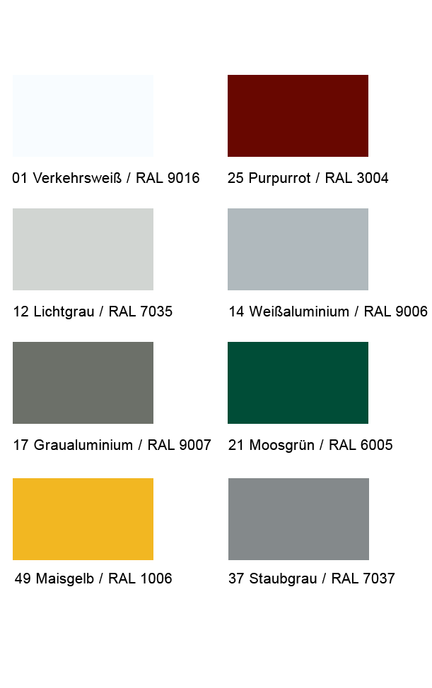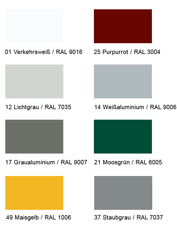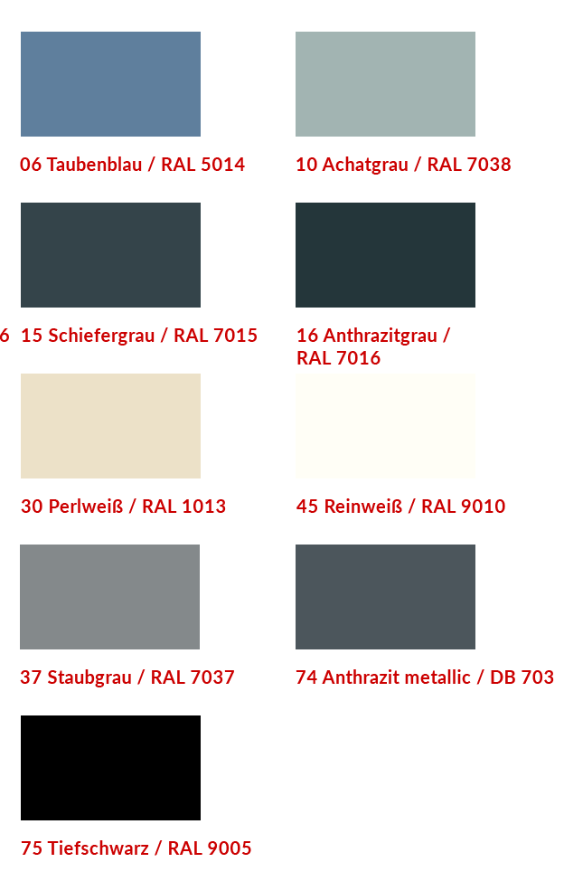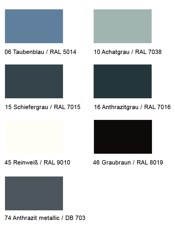 Für die Unterschiene sowie die seitliche Schienenführung (Modell-abhängig) haben Sie die Wahl aus über 650 Farben ohne Mehrpreis. Sollte Ihnen diese Auswahl allerdings nicht genügen, erhalten Sie jede andere Farbe als Option. Ihre Aluminium-Profile erhalten Sie in 16 verschiedenen Designs.